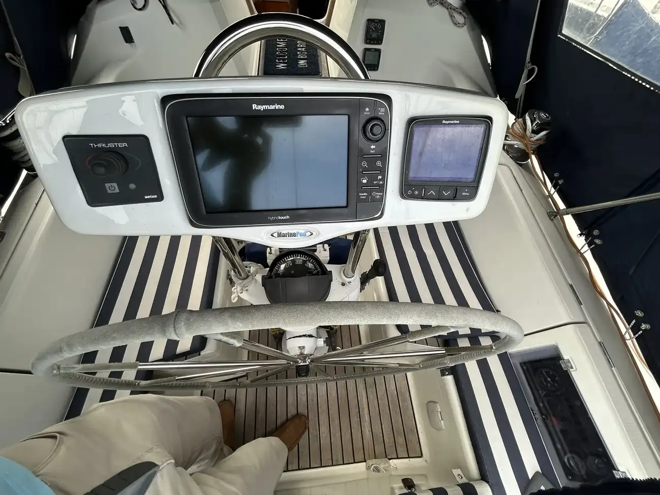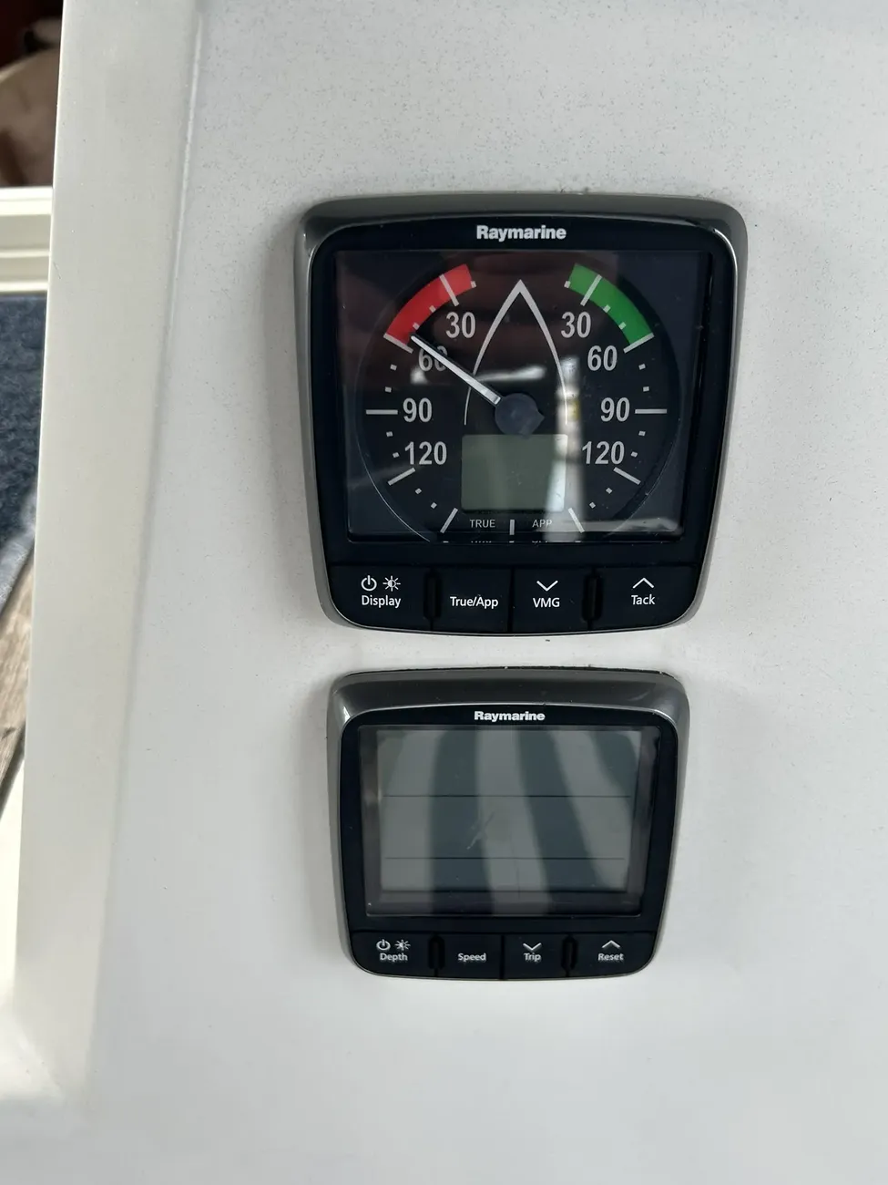 - Raymarine i70 unit (speed/depth/wind) at helm